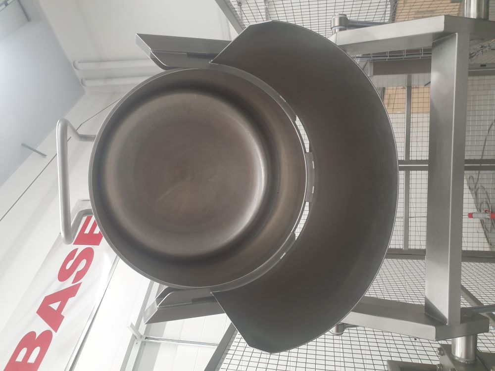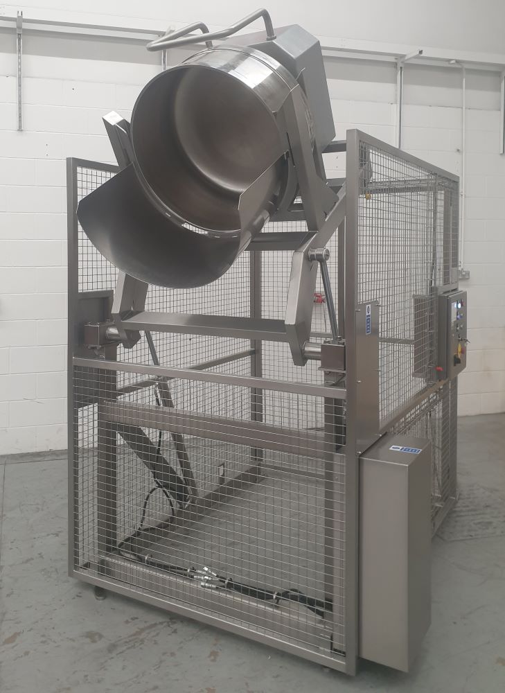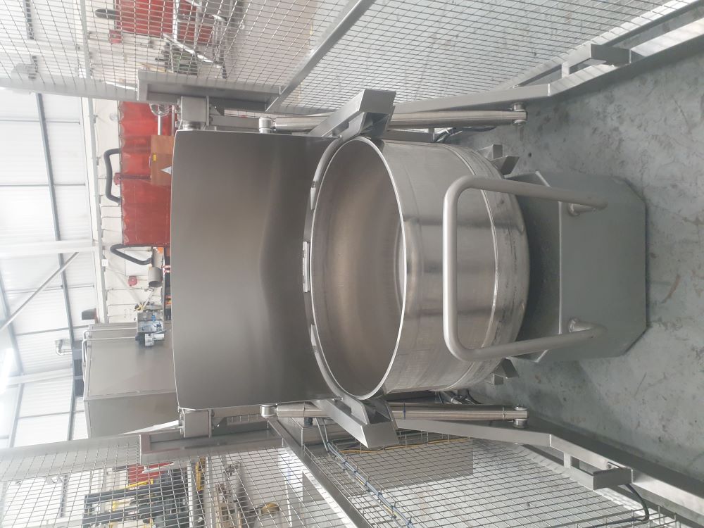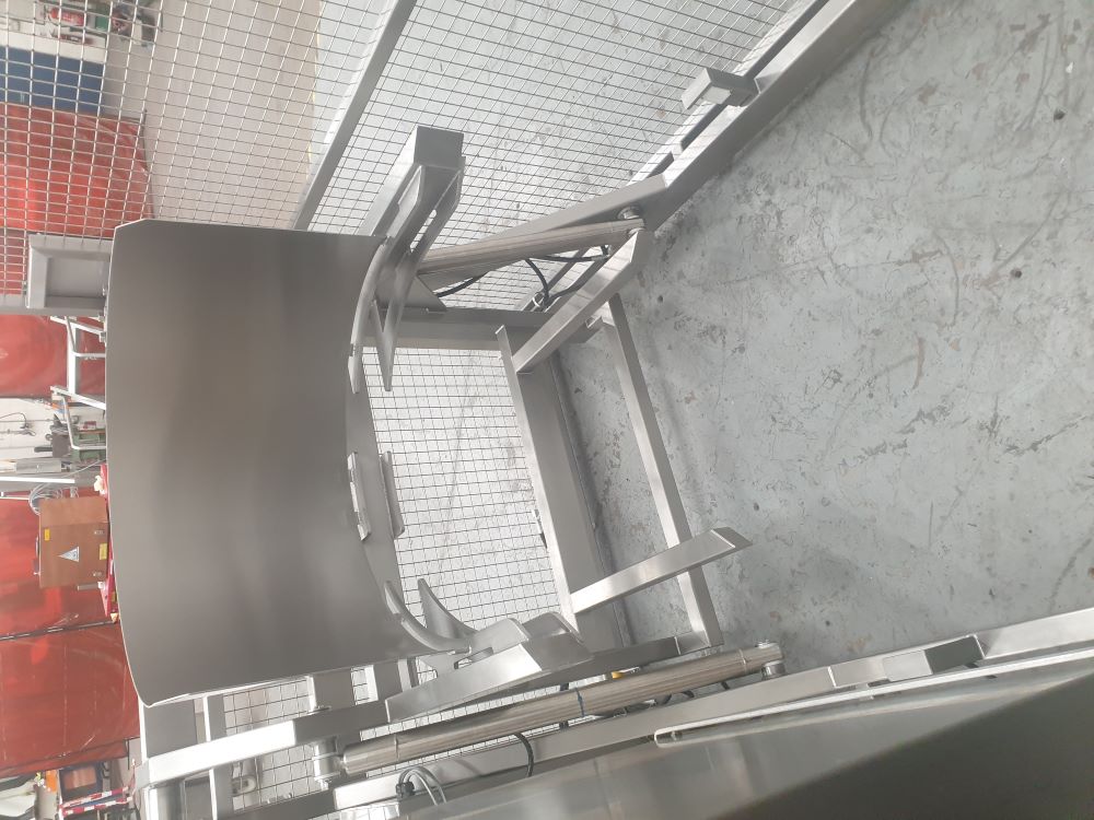 BTH/500/1550/B/G Bakery Bowl TipperThis Bakery Bowl Tipper is a hydraulic machine that is designed to lift and tip a large VMI mixing bowl at a discharge height of 1550mm. The Bakery Bowl Tipper is constructed from Grade 304 stainless steel, is a TIG welded construction throughout and was bolted to the floor. The Bakery Bowl Tipper is powered via a hydraulic powerpack and tips the VMI mixing bowl by the extension of a pair of stainless steel hydraulic cylinders to an angle of 30 degrees past the horizontal. The hydraulic cylinders are fitted with a safety check valve such that even in the unlikely event of a hydraulic hose failure, the raised bin will not fall to the floor. Safety Guard to BS EN 14120:2015 Safety of Machinery GuardsThe Bakery Bowl Tipper was supplied complete with a safety guard to meet the guidelines of BS EN 14120:2015 Safety of Machinery Guards. The safety guard is constructed from 40 x 40 x 3mm stainless steel box section and 2.0 stainless steel sheet which encloses the Bakery Bowl Tipper to a height of 2200mm on both sides, 1180mm at the tipping position with a pair of hinged safety guard doors at the loading position. The guard doors are electrically and mechanically interlocked preventing the Bakery Bowl Tipper from operating when a door is open. Additionally, the guard doors can only be opened when the lift carriage is at the full down position to prevent access whilst a load is raised. Bakery Bowl Tipper Electrical ControlThis Bakery Bowl Tipper was fitted with an IP65 Stainless Steel Control Panel mounted on the main frame at a convenient position to give good maintenance access under the Provision and Use of Work Equipment Regulation 1998 (PUWER). Upper and Lower end of travel limit switches are positioned to prevent inadvertent adjustment or damage but are easily adjustable by trained personnel for fine adjustment on site. Upper and Lower end of travel limit switches are positioned to prevent inadvertent adjustment or damage but are easily adjustable by trained personnel for fine adjustment on site. The bin in place sensor will ensure that the bin is correctly loaded into the lift carriage before obtaining control on this will allow the Bakery Bowl Tipper to operate. The guarded Bakery Bowl Tipper operation is fully latched so that pressing the ‘Up’ push button once will raise the lift to the full tip position. Once the product has been discharged, after a short time period has lapsed, the Bakery Bowl Tipper will return to the full down position. The control panel has a volt free pair of contacts which can be used to connect a ‘Call to Run’ signal if required.