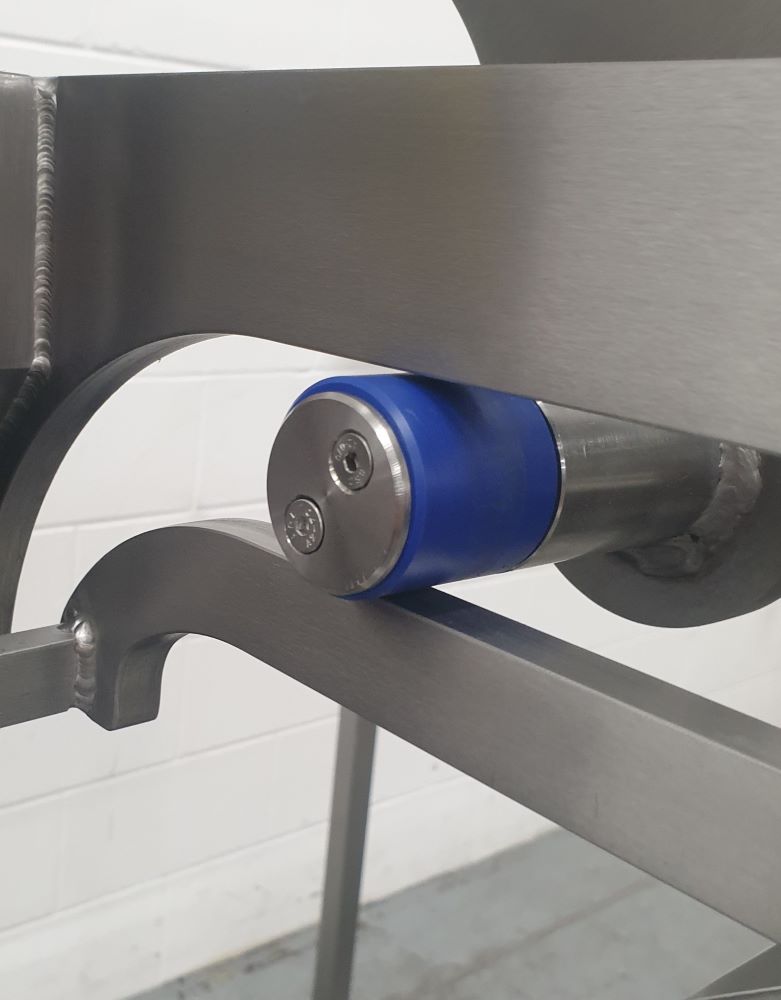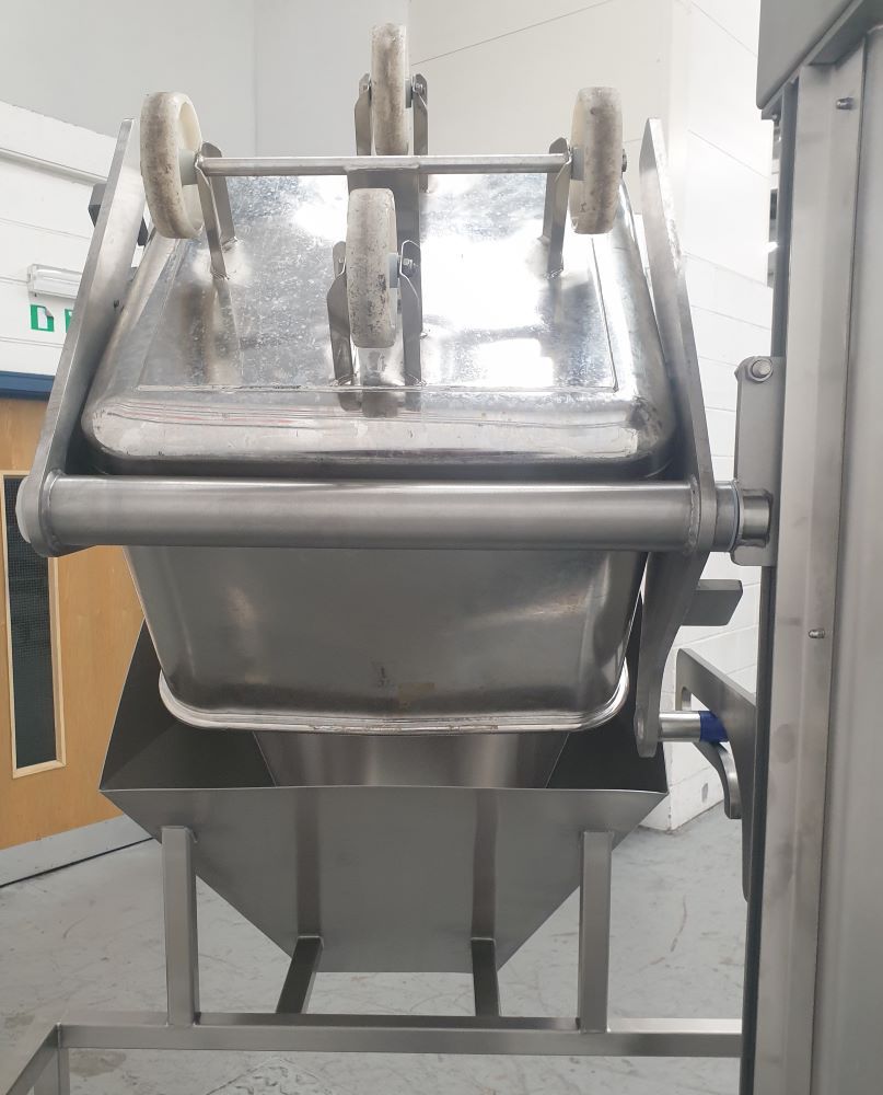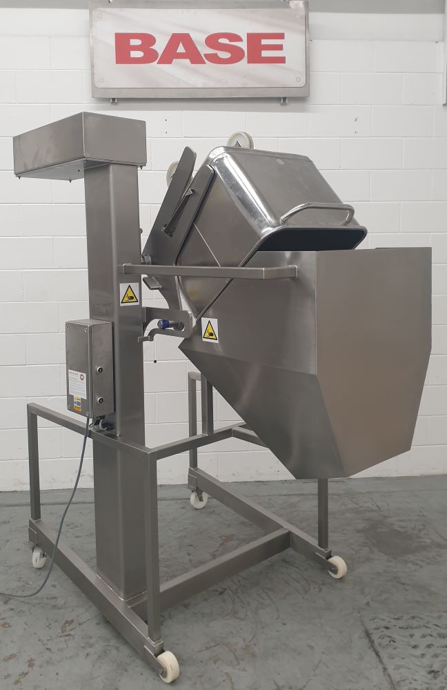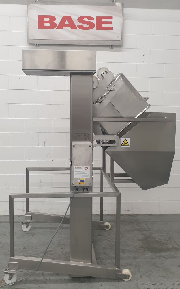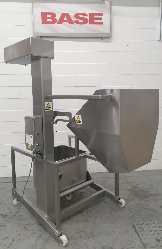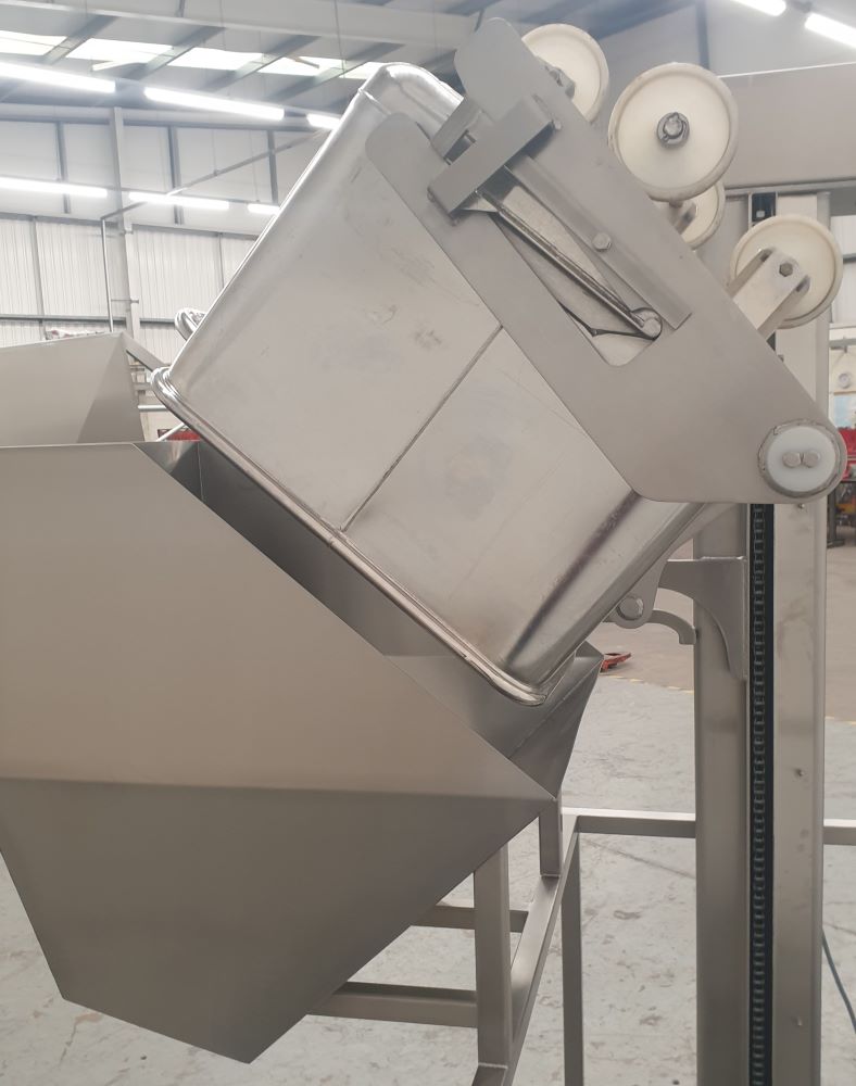 The Dump Buggy Lifter Tipper was designed to lift and tip a 200 Litre Dump Buggy at a discharge height of 1350mm into an intermediate chute. The Dump Buggy Lifter Tipper was manufactured from Grade 304 stainless steel, is a welded construction throughout and is designed to be mobile on castors. The lifting is achieved by a ¾” Simplex chain driven by a motor gearbox mounted at the top of the main column. The unguarded machine is fitted with our unique safety latch which engages automatically in the extremely unlikely event of a lift chain failure.