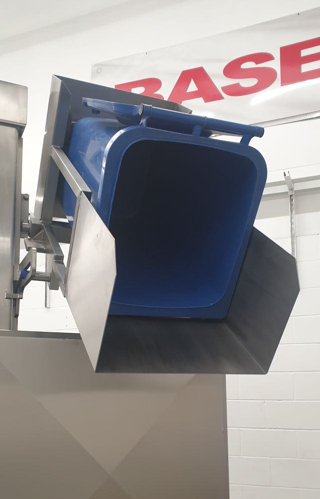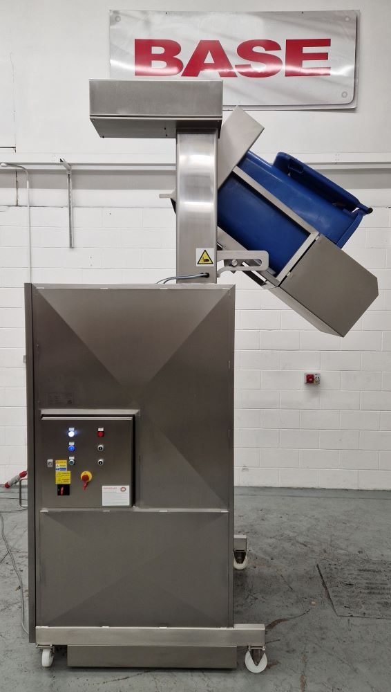 BTM/300/2100/M/G Incinerator Wheelie Bin TipperThis Incinerator Wheelie Bin Tipper was designed to lift and tip a 240 Litre Wheelie Bin at a discharge height of 2100mm to load an Incinerator. The Incinerator Wheelie Bin Tipper was manufactured from Grade 304 stainless steel, is a welded construction throughout and is designed to be bolted to the floor. The lifting is achieved by a ¾” Simplex chain driven by a motor gearbox mounted at the top of the main column. Safety Guard to BS EN 14120:2015 Safety of Machinery GuardsThe Incinerator Wheelie Bin Tipper was supplied complete with a safety guard to meet the guidelines of BS EN 14120:2015 Safety of Machinery Guards. The safety guard is constructed from 40 x 40 x 3mm stainless steel box section and 2.0mm stainless steel sheet. It encloses the Incinerator Wheelie Bin Tipper to a height of 2200mm on two sides, 2000mm on the tipping side with a hinged guard door on the fourth side. The guard door is electrically and mechanically interlocked preventing the Incinerator Wheelie Bin Tipper from operating when the door is open. Additionally, the guard door can only be opened when the lift carriage is at the full down position to prevent access whilst a load is raised. Incinerator Wheelie Bin Tipper Electrical ControlThe Incinerator Wheelie Bin Tipper was fitted with an IP65 Stainless Steel Control Panel which is mounted on the main column at a convenient position to give good maintenance access under the Provision and Use of Work Equipment Regulation 1998 (PUWER). Upper and Lower end of travel limit switches are positioned to prevent inadvertent adjustment or damage but are easily adjustable by trained personnel for fine adjustment on site. The control panel incorporates the following controls; Up, Down, Guard Release, Emergency Stop and a Reset Facility. The Incinerator Wheelie Bin Tipper operation is latched so that pressing the ‘Up’ push button once will raise the lift to the full tip position. Once the product has been discharged, pressing the ‘Down’ push button once will return the Incinerator Wheelie Bin Tipper to the full down position. The control panel has a volt free pair of contacts which can be used to connect a ‘Call to Run’ signal if required.